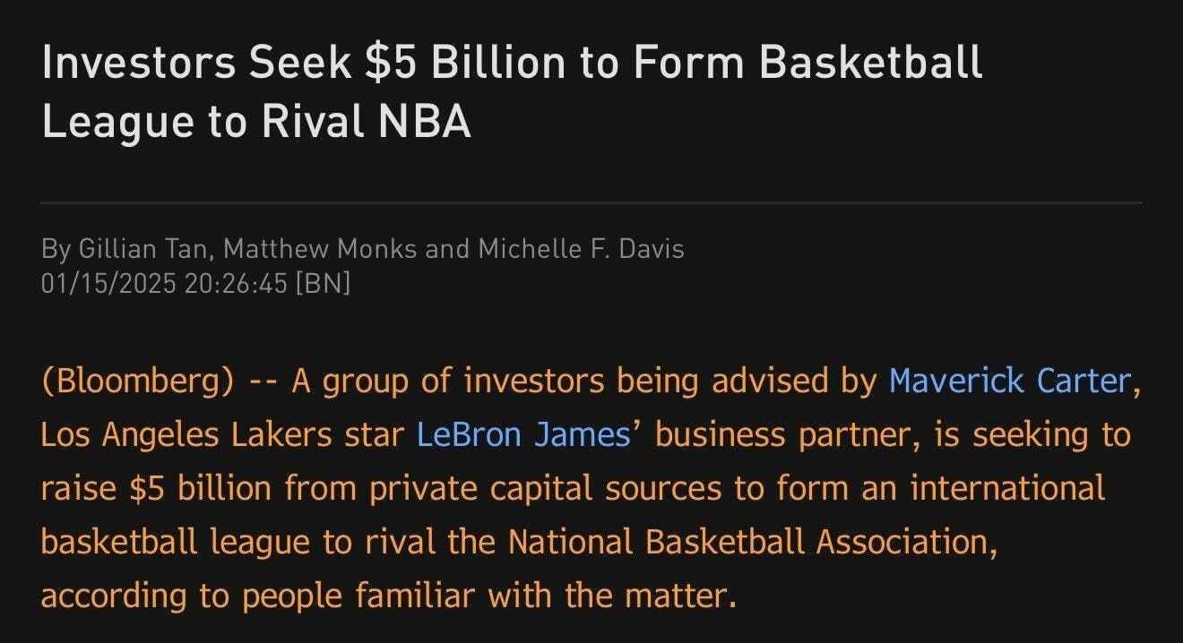 Investors target $5B raise to launch basketball league with LeBron James' business partner Maverick Carter (Jan. 16th)